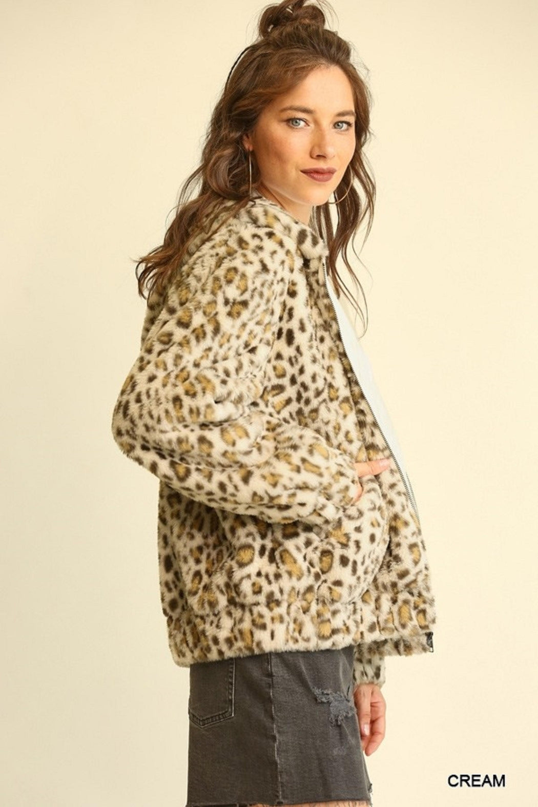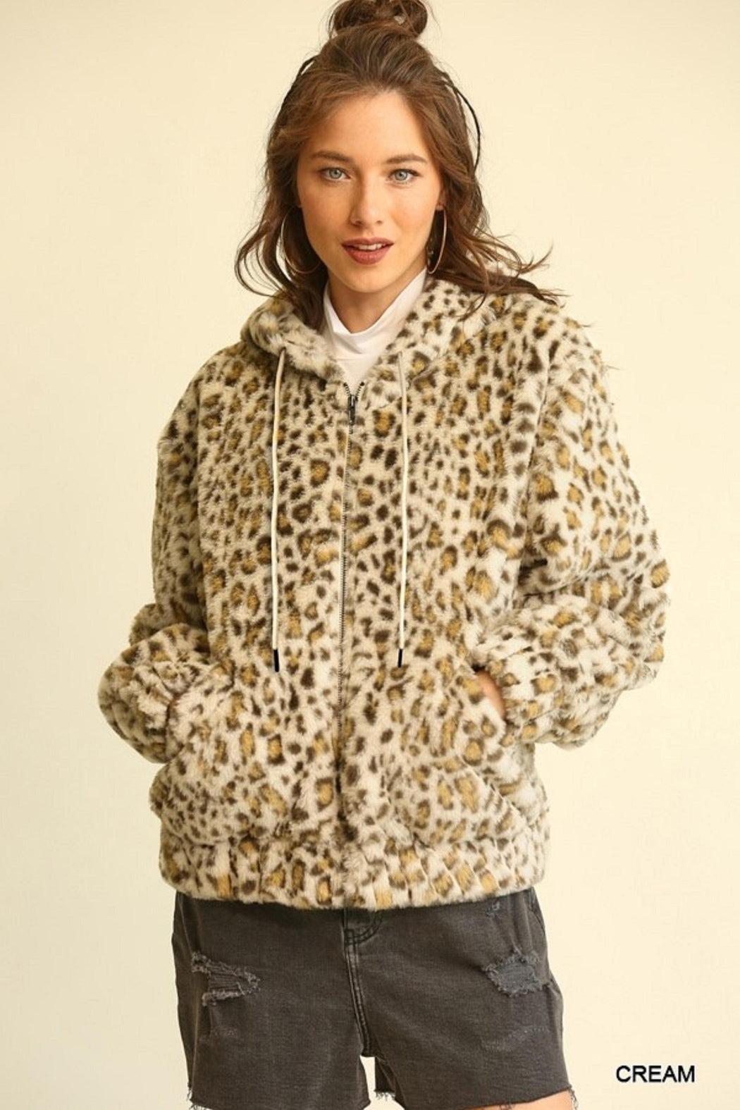 Faux Fur winter jacket for women - Leopard Print Design - brown and cream with hoodie