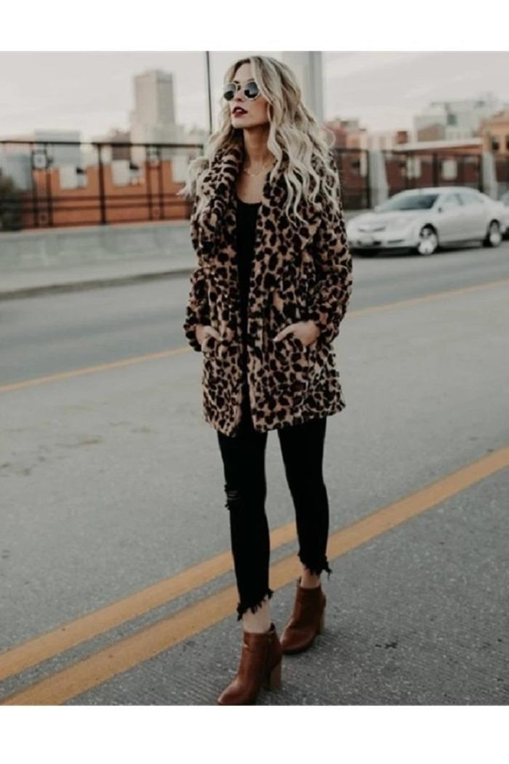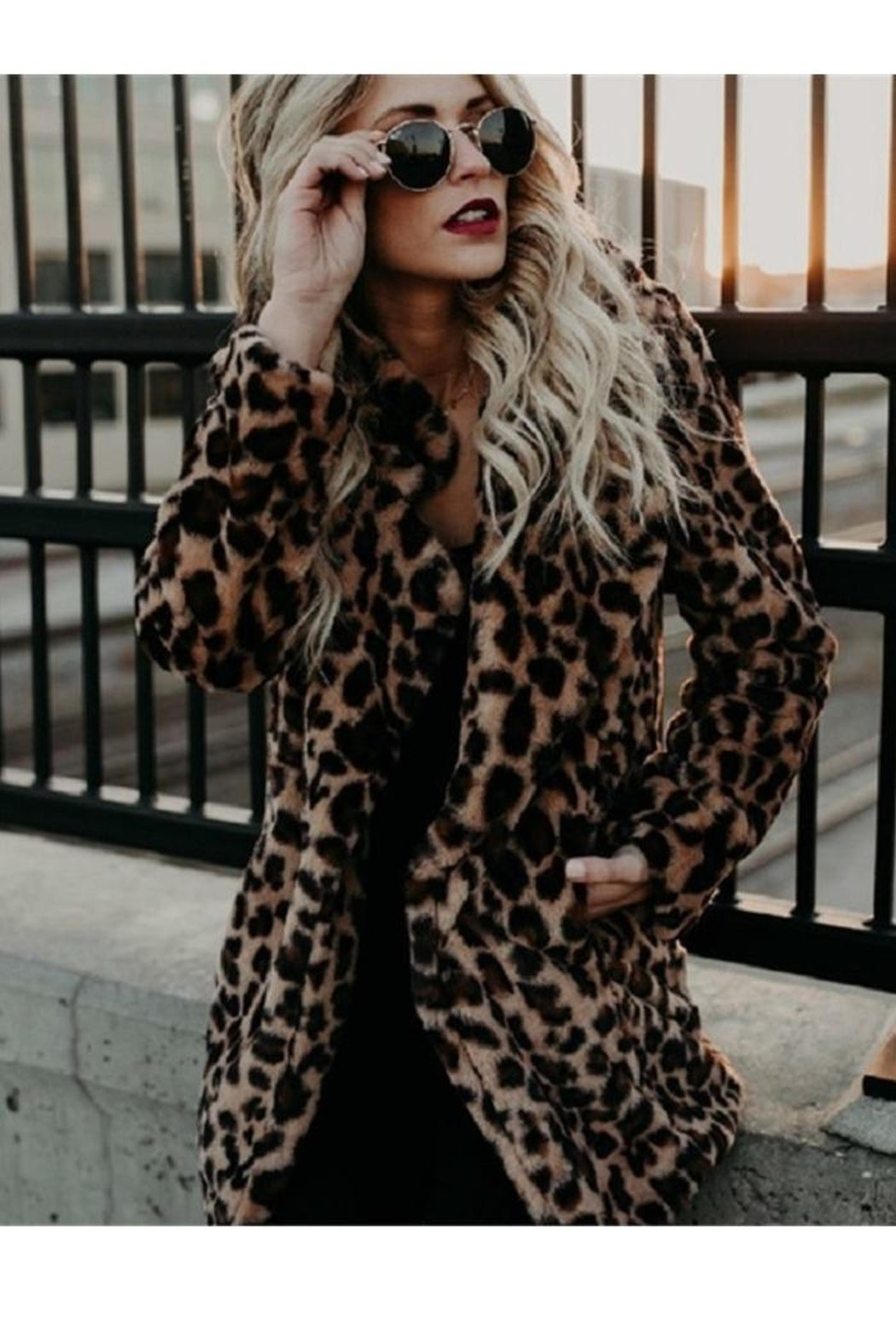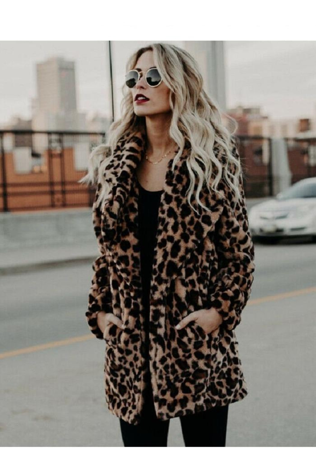 Womens Faux Fur Leopard Print Winter Warm Jacket Trench Coat Fluffy Overcoat Top