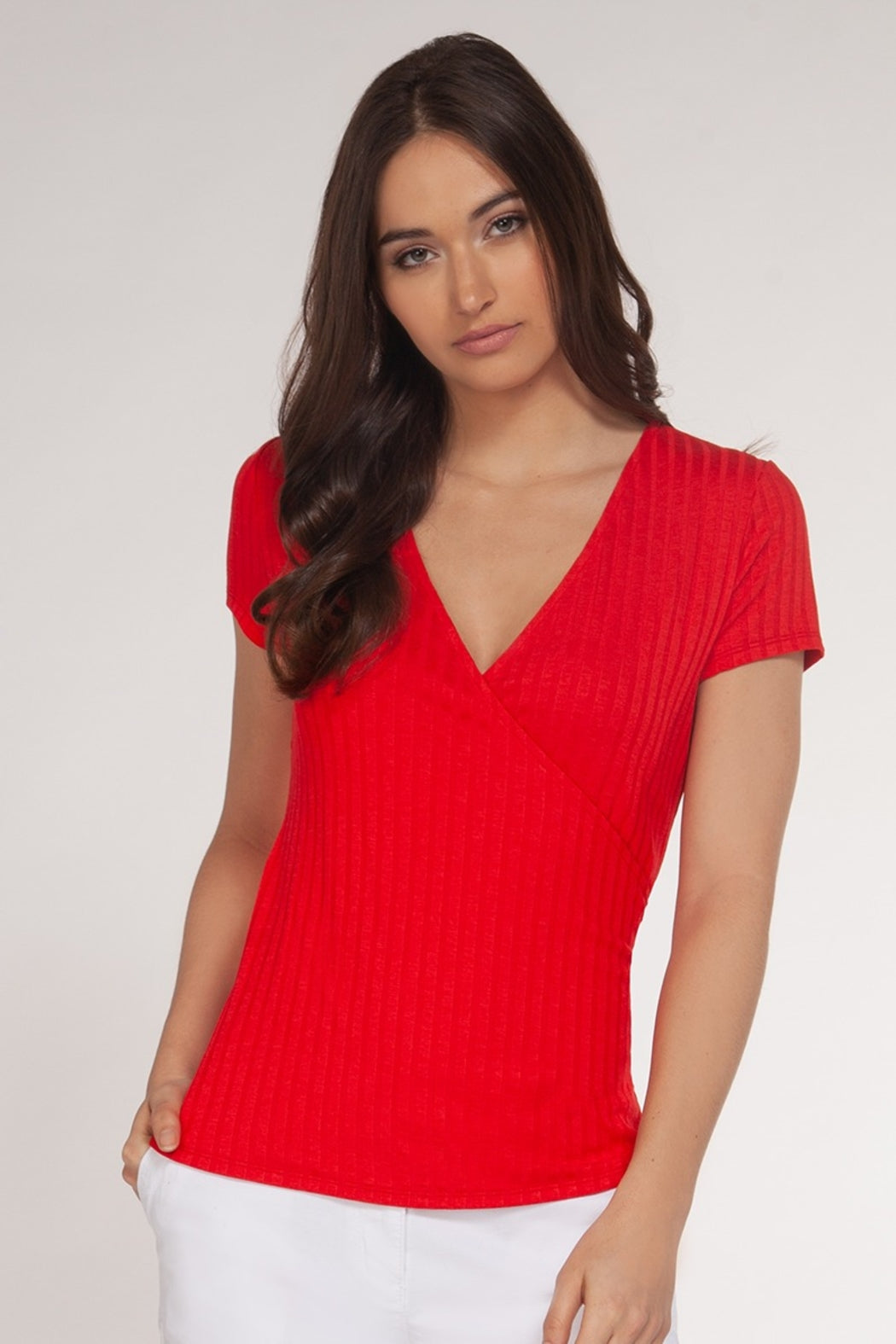 Wrap Short Sleeve Deep V Neck Ribbed Shirt Has Cinched on Side