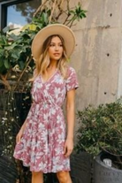 How adorable is this wrap style dress with an elastic waist? It has a fun waffle texture with a nice dusty red color with hints of greys, tans, and blues. This is a must have dress for summer!