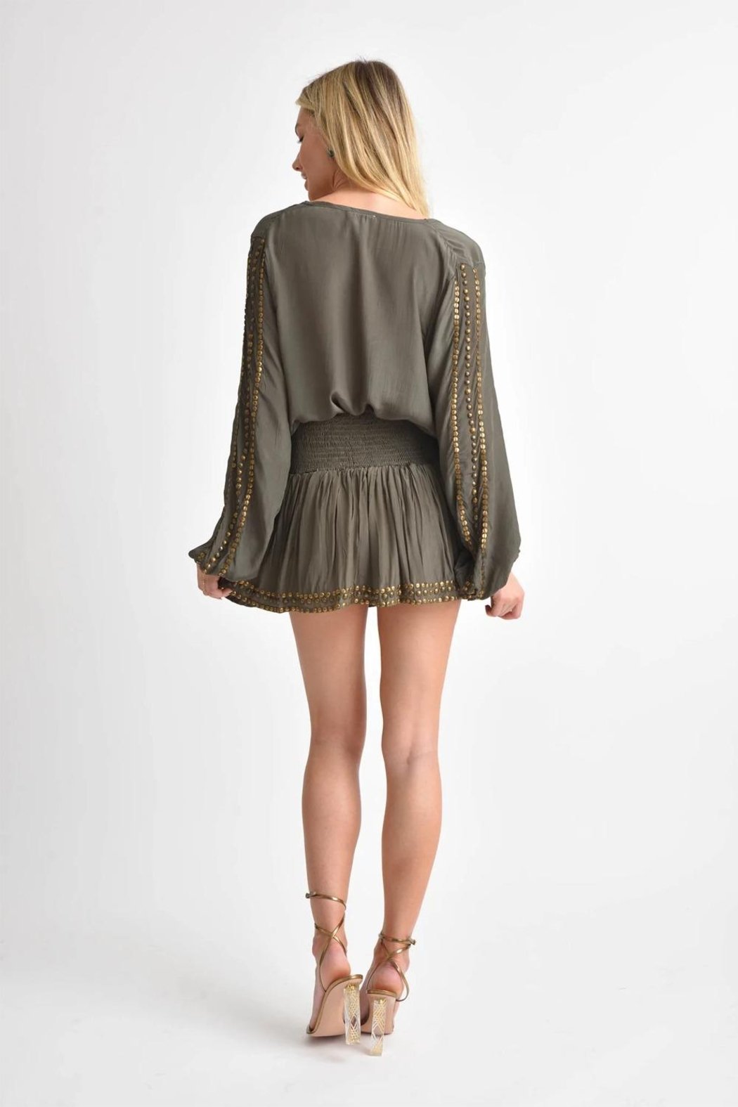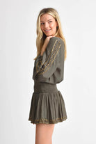 We love the Xiu collection, and now we're introducing a mini skirt! This mini features a stud detail along the bottom of the skirt. It has elastic waistband and comes in black and green, for endless possibilities of styling.
