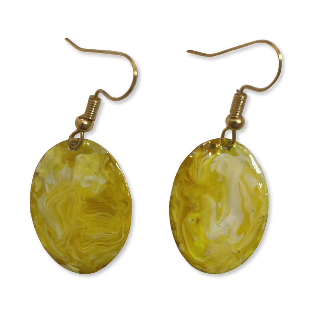 These hand painted yellow marbleized mini oval earrings are from our signature collection of Lures of Love Earrings.