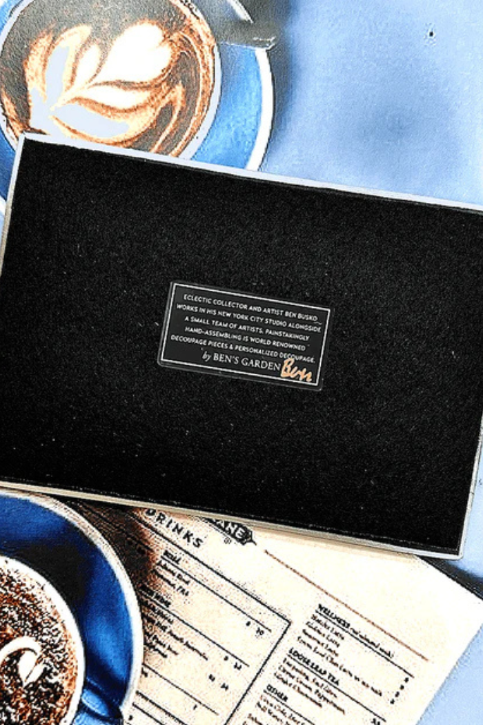 In the French tradition of decoupage, these bent-glass trays are handcrafted in our New York Studio. They feature vintage typeset on a natural cream background, and each is individually signed by Ben. Both practical and charming, Ben's signature decoupage is all food safe, wipe clean and the back side is felted.