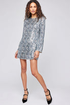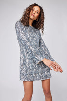 This long sleeve flowy mini dress features a blue and silver allover sequin abstract pattern. Featuring a back zip and subtle bell sleeve, this flirty little dress is easy and fun to wear.