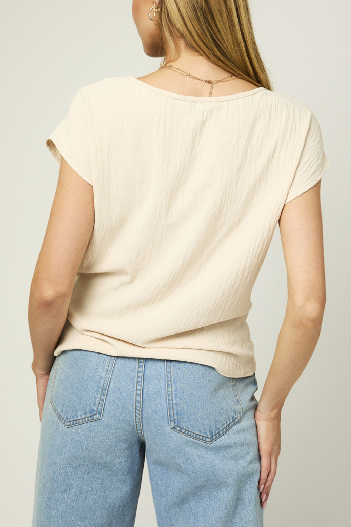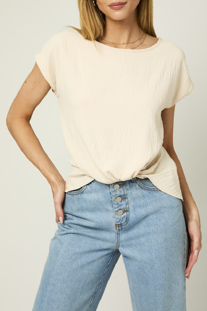 Pullover, cap sleeve, side twist knot top. Model is wearing a size small. Refer to measurements for your perfect fit. Across chest measurements; Small 19", Medium 20", Large 21". Shoulder to front hem; Small 23", Medium 23.5", Large 24".
