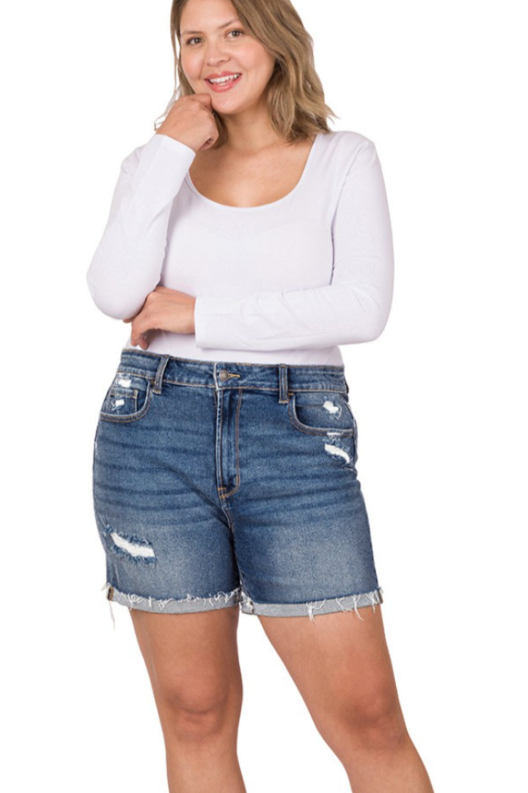 Plus size distressed denim shorts. Ultra comfy with stretch fabric and light frayed hem