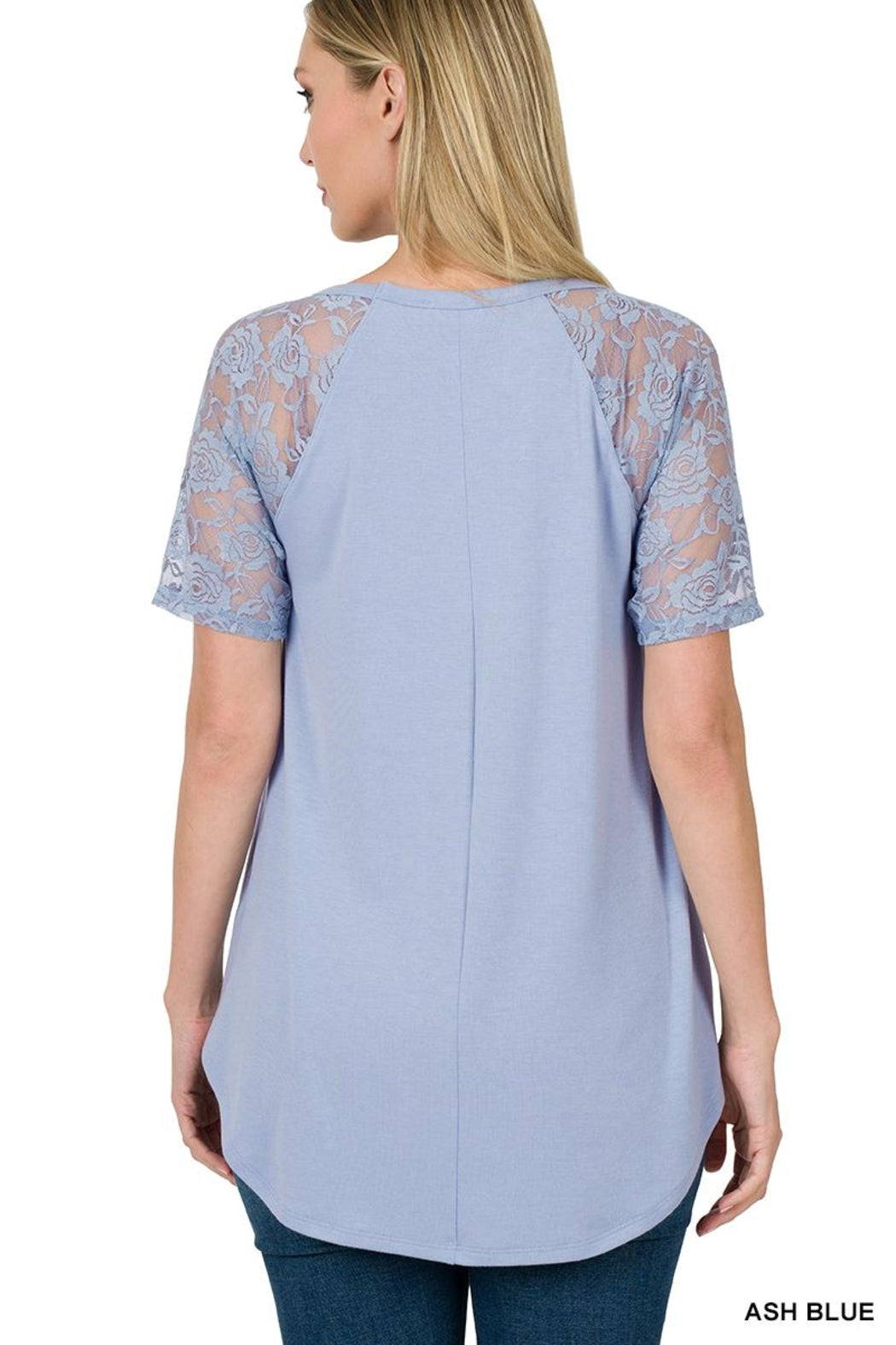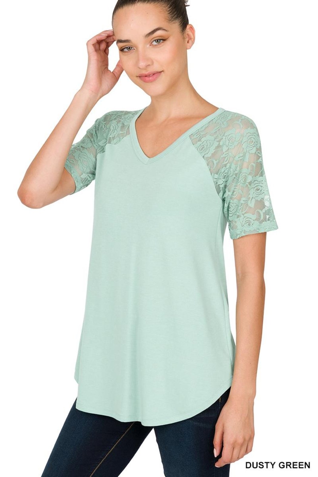 Zenana Outfitters Lace Detail Top V-Neck Short Sleeve Round Hem Green