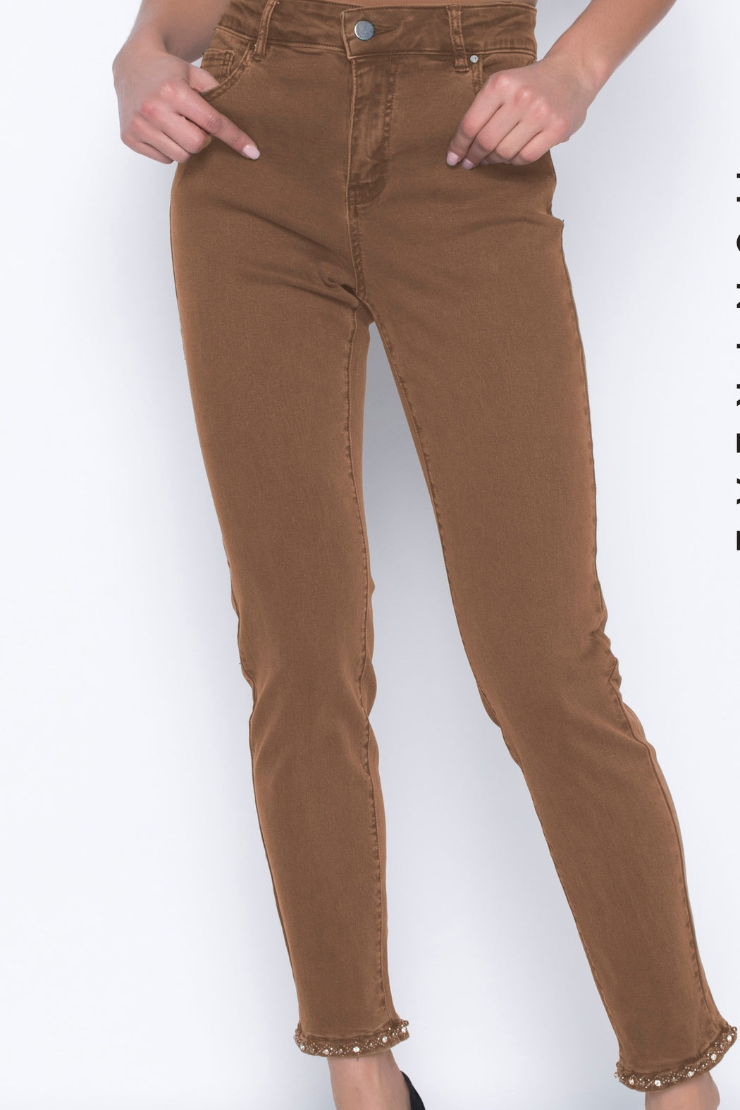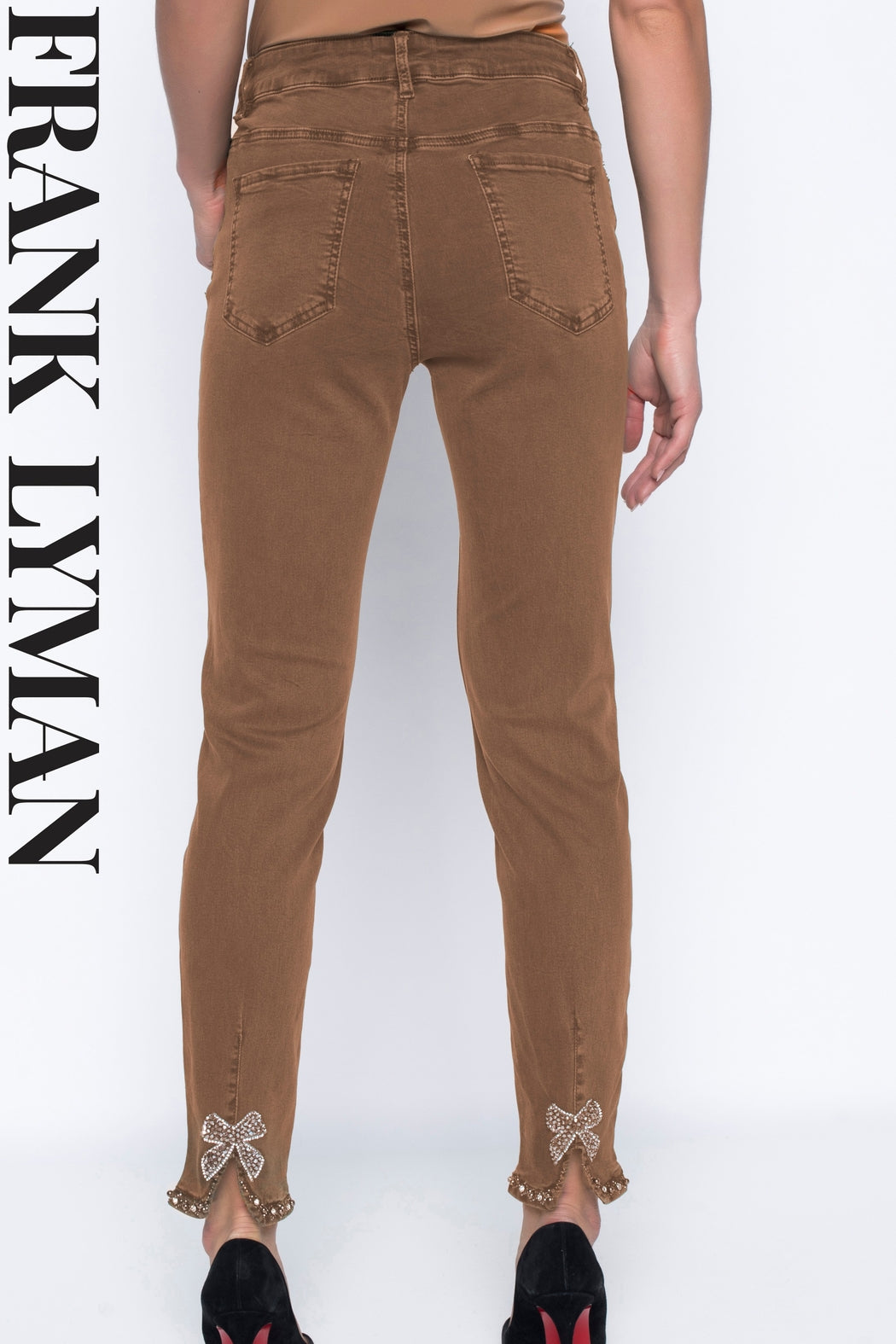 Zip Front Woven Jean Pant from Frank Lyman. Ankle length with black pearl bow detail. 85% Cotton 12% Polyester 3% Elastane