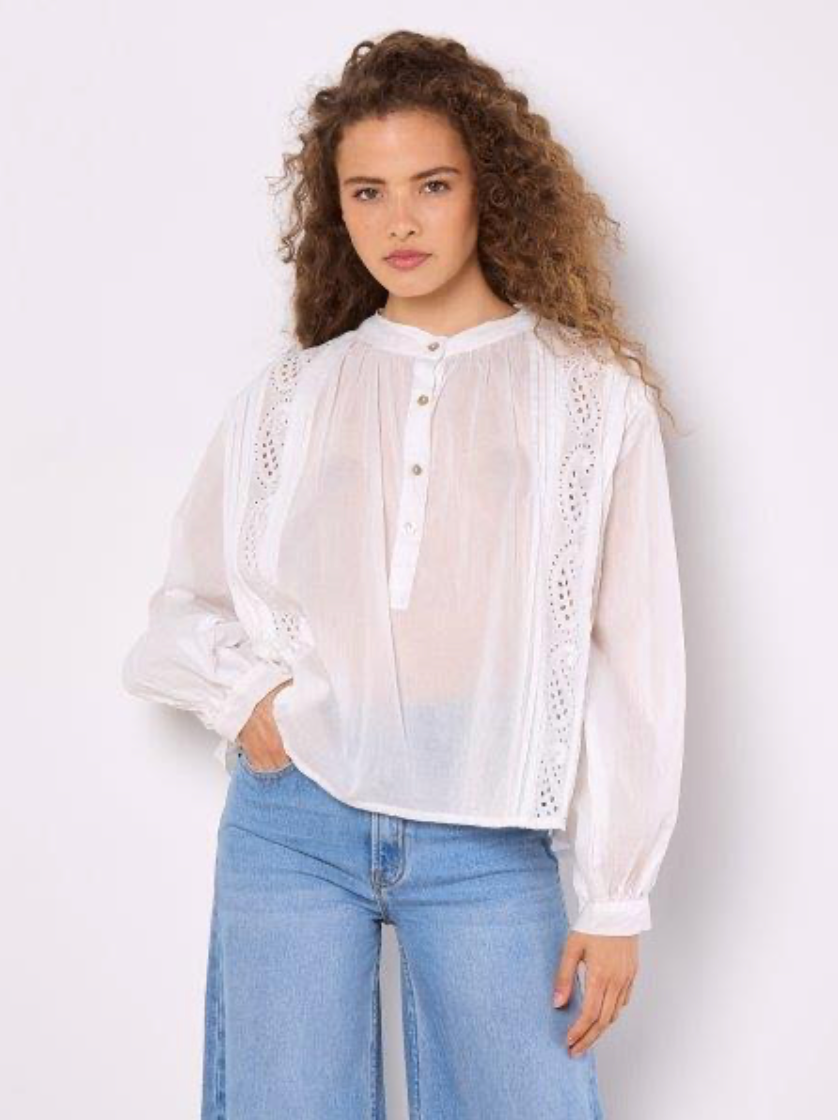Expertly crafted with a lightweight design, the Cameron Blouse boasts delicate eyelet details and a quarter button front. In a crisp white hue, this versatile piece is a must-have for any wardrobe. Perfect for any occasion, it offers both style and comfort.
